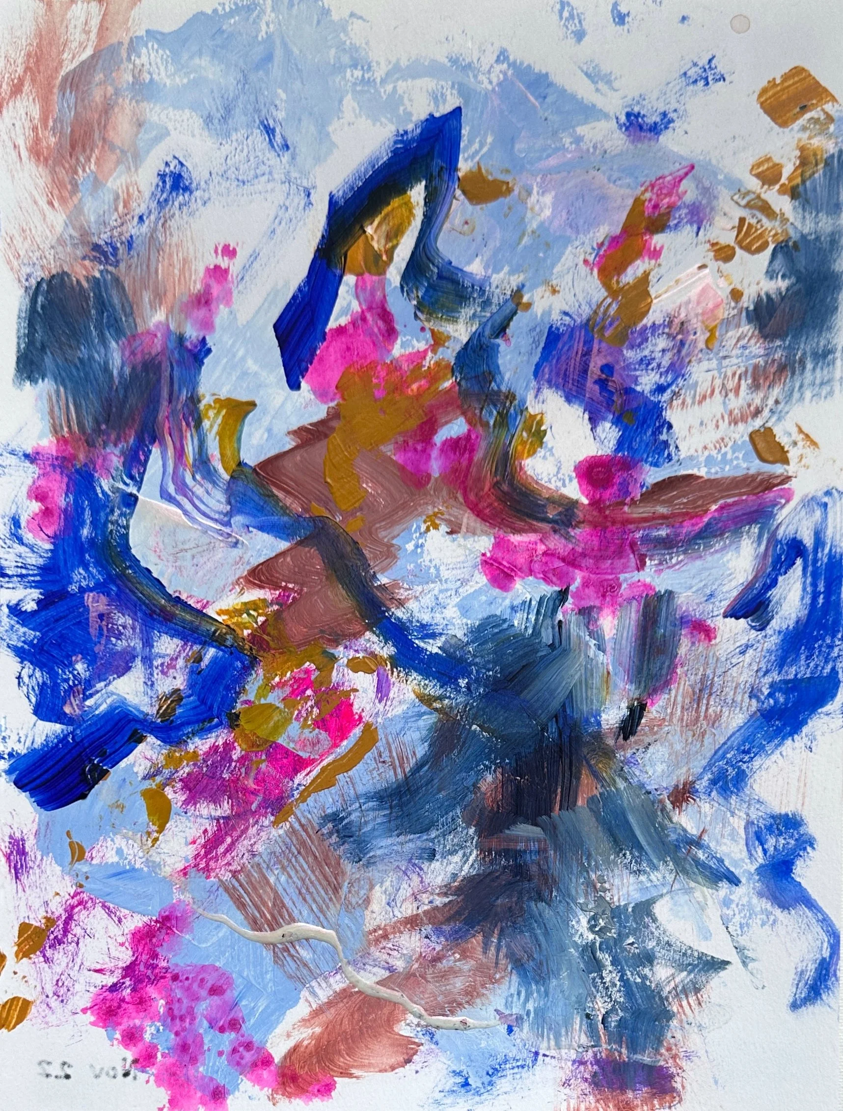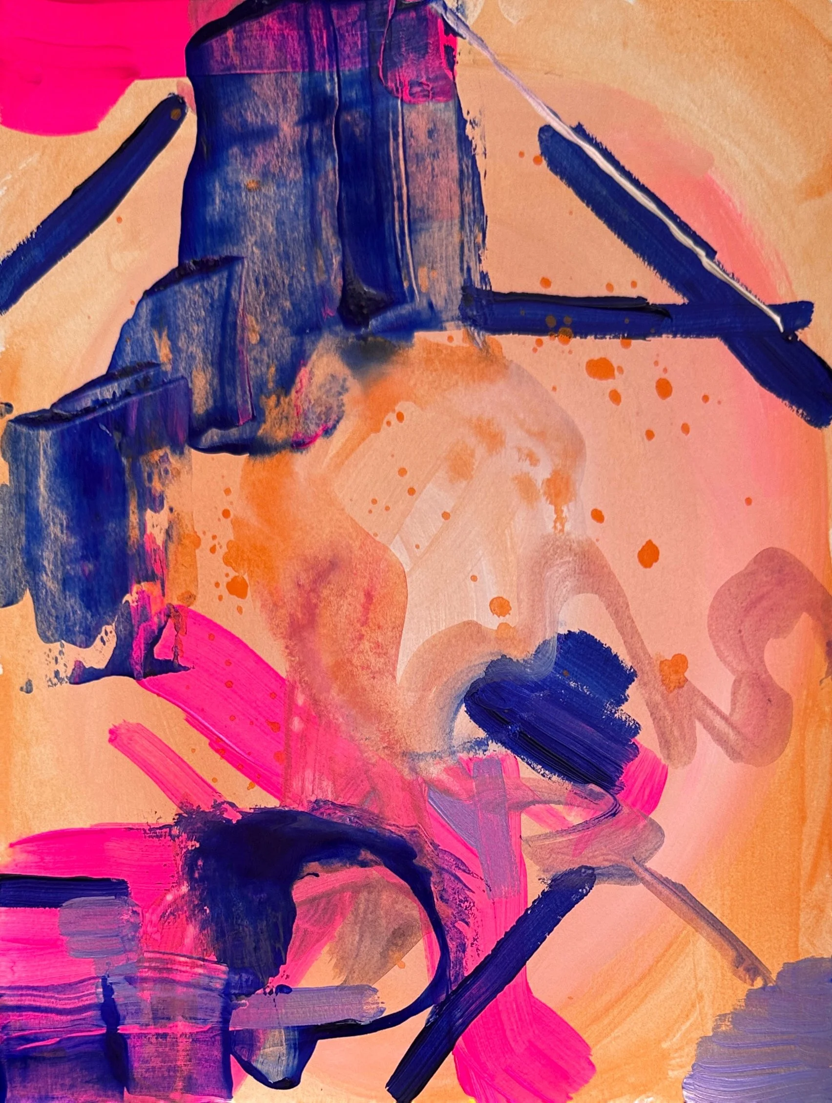 My abstract expressionist series Attack To Work: Masked Barista is an exploration of my experience working full-time in the service industry during the ongoing Covid-19 pandemic. The pressure and expectation of productivity amidst intense collective grief, the lack of space provided to be my full self, and all the need for masking as a form of self-preservation are all themes that are present in this series.